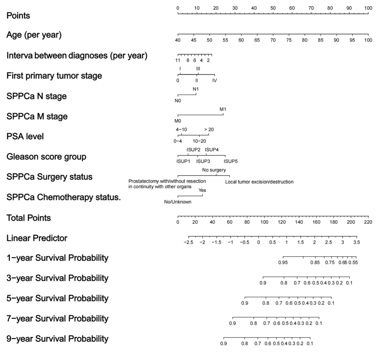前列腺癌是世界范围内男性最常见的恶性肿瘤,也是较常见的第二原发肿瘤。约10%的前列腺癌患者有既往肿瘤病史,这些患者的预后比无既往肿瘤史的患者更差。[5,6]然而,受限于相对较低的发生率,目前对于有既往肿瘤病史的前列腺癌(SPPCa)患者的临床和预后特征尚缺乏深入了解,对SPPCa患者的治疗与管理缺乏高质量临床证据。因此,基于美国SEER(Surveillance,Epidemiology,and End Results)数据库的大样本肿瘤人群队列,我们开展了本研究,旨在分析SPPCa患者的临床特征和预后因素,构建预后预测模型并绘制列线图,为优化SPPCa的个体化治疗提供临床证据。