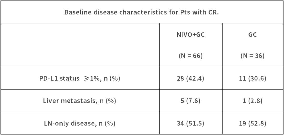 CheckMate 901试验中纳武利尤单抗和吉西他滨+顺铂联用对比单用吉西他滨+顺铂获得完全缓解的患者特征,及仅淋巴结转移性尿路上皮癌患者的特征(摘要号:4509)