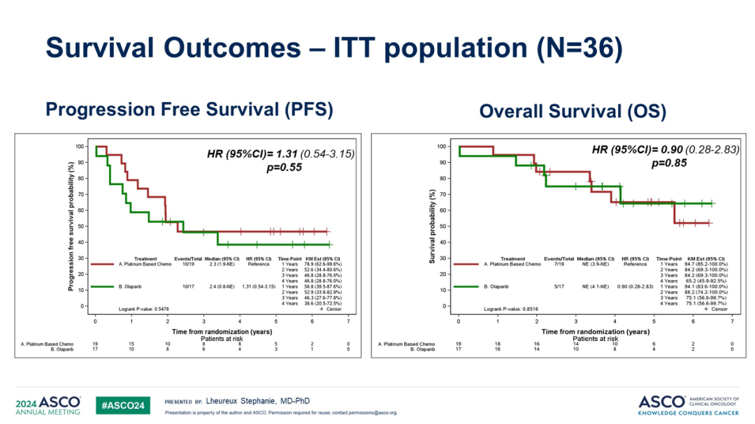 从2017年2月至2021年9月,共入组44名患者,36名患者随机分配(A组:n=19;B组:n=17)。两名患者退出,6名患者(全部为BRCA1/2野生型)因在新辅助奥拉帕利治疗期间疾病进展而被分配到A组。研究的中位随访时间为3.96(2.23-5.29)年。中位年龄为59(53-66)岁,约31%有已知有BRCA1/2突变。