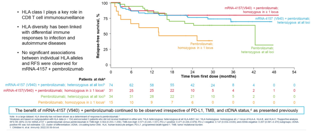 本次分析的中位随访时间为3年,结果显示,与帕博利珠单抗单药相比,mRNA-4157+帕博利珠单抗具有持久而有意义的长期RFS和DMFS获益。同时还观察到联合治疗可改善OS的趋势。HLA和转化亚组结果表明,相较于帕博利珠单抗单药,mRNA-4157+帕博利珠单抗可能使更多患者获益。