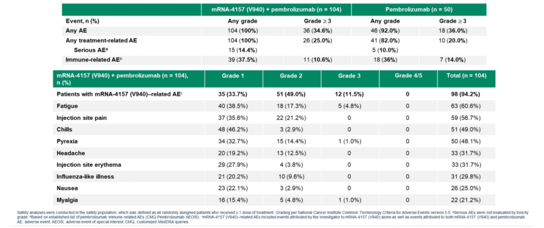 患者对mRNA-4157的耐受性良好,mRNA-4157+帕博利珠单抗联合治疗的安全性与先前分析一致,没有增强免疫相关不良事件。