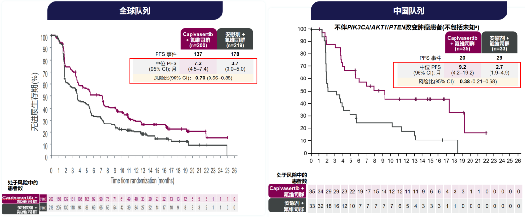 Hope S Rugo教授:我们目前还不知道答案。我认为目前取得的进展是有帮助的。显然,受益的患者数量远远超过了您在中国队列中观察到的68例明确非PAM通路突变的患者。未知通路变异的患者约占16%,此类患者非常重要,因为FDA在进行建模时不能确定如果所有这些患者都发生变异,是否会维持受益。因为会有更多的患者被归类为野生型(Wild type),而实际上却有突变。我认为一旦我们可以使用ctDNA进行检测,这将会非常有帮助,因为它将更清楚地告诉我们野生型疾病的患者群体。目前,我们只能根据一定的百分比来作出判断,而使用ctDNA将会更加准确。虽然风险比有所上升,但仍然相当令人满意。我认为卡匹色替在未发生PAM通路基因突变的人群中可能效果相当不错,但我们还没有足够的数据来证明这一点,这是一个非常重要的队列。当然,两组68例患者的样本量,大约相当于一项2期试验,我们仍需要扩大样本的研究进一步验证。