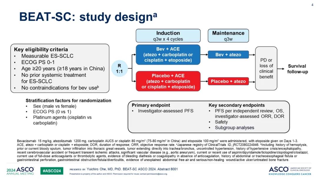 Ohe Y,Han B,Nishio M,et al.BEAT-SC:a randomized phase III study of bevacizumab or placebo in combination with atezolizumab and platinum-based chemotherapy in patients with extensive-stage small cell lung cancer(ES-SCLC).Presented at the 2024 American Society of Clinical Oncology Annual Meeting;May 31-June 4,2024;Chicago,Illinois.