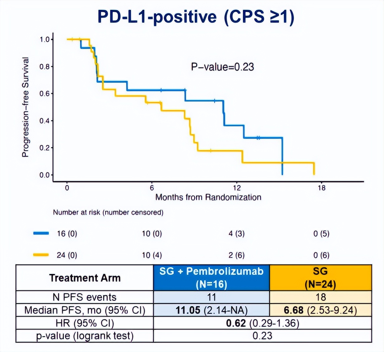 在中位随访12.5个月时,SG联合帕博利珠单抗治疗组的中位PFS为8.12个月,SG单药治疗组为6.22个月,但两组之间的差异未达到统计学显著性(HR 0.81,95%CI:0.51~1.28,P=0.37);ORR分别为21.2%和17.3%;OS数据尚不成熟,迄今只有26例,SG联合帕博利珠单抗治疗组和SG单药治疗组分别为18.52个月和17.96个月(HR 0.65,95%CI:0.33~1.28)。尽管在PD-L1阳性的患者亚组中观察到SG联合帕博利珠单抗治疗组的PFS(11.05 vs 6.68个月)和OS(18.52 vs 12.5个月)有所改善,但这些改善同样未达到统计学显著性。安全性与既往报告一致,未发现新的安全性信号。