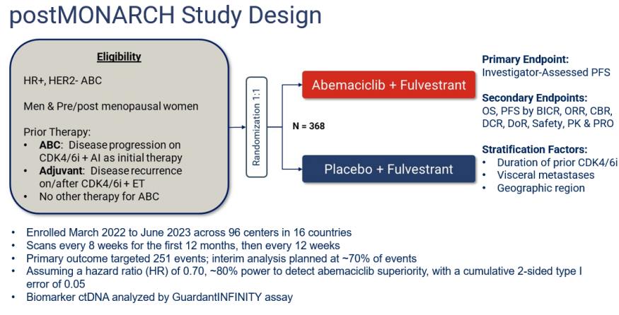 postMONARCH研究是一项前瞻性、III期、随机对照研究,要求入组HR+/HER2-晚期乳腺癌患者,绝经前或绝经后女性和男性患者均可以入组,患者晚期阶段应用AI+CDK4/6i初始治疗后疾病进展,或者辅助ET+CDK4/6i治疗中或治疗后疾病复发,且在晚期阶段没有接受过其他治疗。来自16个国家96家医学中心的368例符合入组标准的患者,1:1随机分组接受阿贝西利+氟维司群或安慰剂+氟维司群治疗,主要终点是研究者评估的PFS。