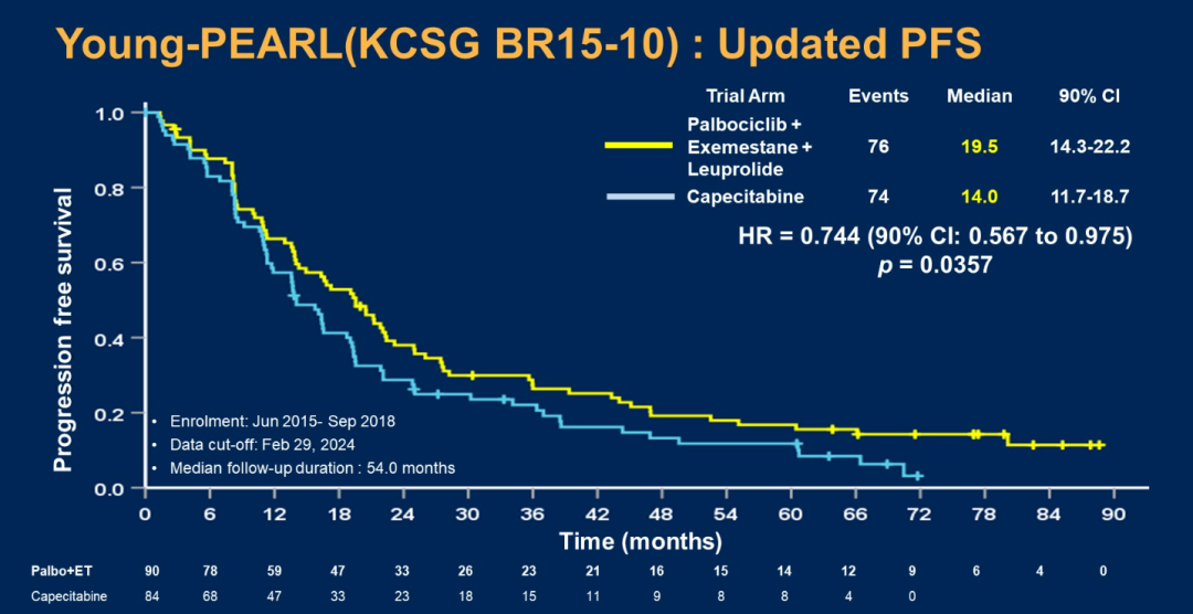 Ⅱ期Young-PEARL(KCSG-BR 15-10)研究在绝经前HR+/HER2-晚期乳腺癌患者中,将哌柏西利联合内分泌治疗与化疗进行对比。研究成果在2019年ASCO年会首次公布了主要研究终点PFS分析结果。2024年ASCO大会上,该研究报道了延长随访至54个月的PFS及OS分析结果,为CDK4/6抑制剂哌柏西利联合内分泌治疗在HR+/HER2-晚期乳腺癌中的应用提供了重要参考价值。
