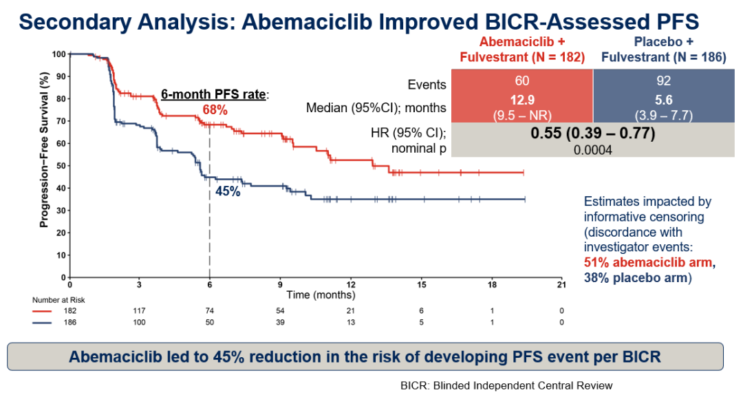 次要研究终点为BICR(独立评审委员会)评估的PFS,阿贝西利+氟维司群vs安慰剂+氟维司群中位的BICR评估PFS分别为12.9个月vs 5.6个月(HR 0.55,P=0.0004),阿贝西利的加入可以较氟维司群单药降低45%的疾病进展或死亡风险。研究者评估的ORR试验组和对照组分别为17%vs 7%,BICR评估的ORR分别为23%vs 8%。