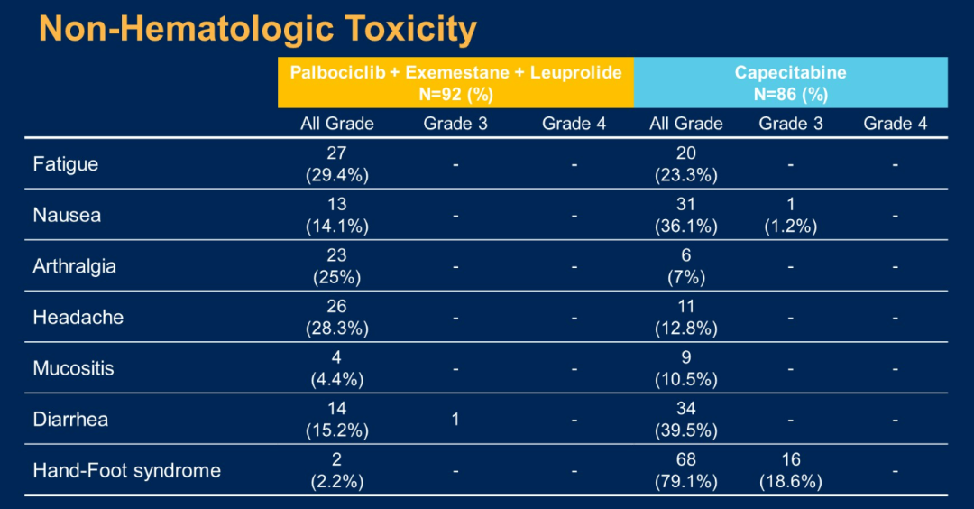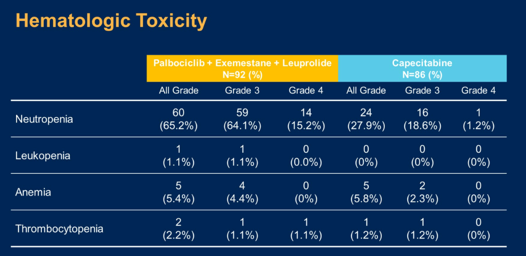 安全性分析显示,哌柏西利联合内分泌组的最常见的血液学毒性为中性粒细胞减少(任意级别发生率分别为:65.2%vs 27.9%);卡培他滨组主要表现为手足综合征(2.2%vs 79.1%)。