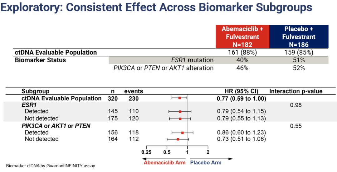 在由320例接受ctDNA评估的关键生物标志物亚组中,无论是否存在ESR1突变,PIK3CA或AKT1或PTEN突变,均能从阿贝西利中获益。安全性与已知的阿贝西利情况一致,停药率低。