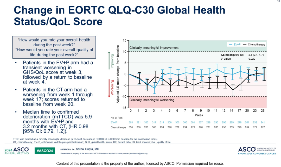Van Der Heijden教授:我认为关注患者在治疗过程中的实际经历与感受极其重要。所以本次ACSO会议Gupta教授口头汇报的EV-302研究PRO结果具有重要临床意义,值得我们在临床实践中去参考。虽然填写电子患者报告结果(ePRO)的患者数量在组间不均衡,其主要原因为出现疾病进展而停止试验药物治疗的患者不再填写ePRO,但研究结果提示EV-P方案组较标准化疗组对提高治疗期间患者的生活质量优势明显。虽然在EV-302/KEYNOTE-A39研究中,我们进行了大量的ePRO数据收集,这是很好的数据,数据结果也将有助于UC患者的疗效评估。但我认为我们还需更多共同努力,了解UC患者在治疗过程中真正的临床需求和治疗痛点。