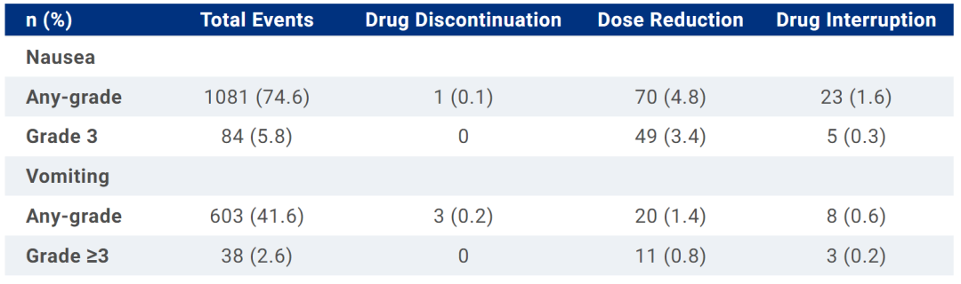 Yeon Hee Park等人报道一项研究[4],汇总分析了7项1-3期临床试验的1449例患者,包括HER2+和HER2-L乳腺癌、HER2+胃癌和HER2突变型非小细胞肺癌等。总体来看,恶心和呕吐事件的发生率分别为74.6%和41.6%,但≥3级的恶心和呕吐事件发生率仅为5.8%和2.6%;大多数恶心和呕吐发生在治疗开始后的21天(第1周期)内。值得注意的是,仅有0.1%和0.2%的恶心和呕吐事件导致停药,导致减剂量或者治疗中断的比例也普遍非常低(下表)。这些数据表明大多数T-DXd的恶心和呕吐事件发生在治疗前21天,随后可得到缓解,而且几乎没有导致停药,可在治疗早期(前21天)关注此类事件的评估和管理。