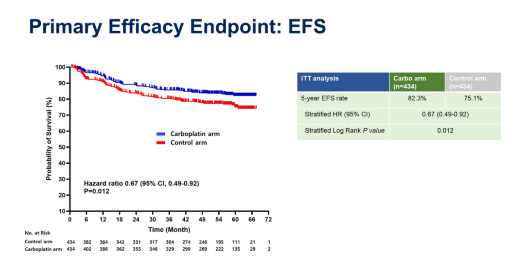 该研究共纳入了868例患者,在中位随访5年时,研究达到主要终点,与对照组相比,卡铂明显改善了EFS(82.3%vs.75.1%;HR 0.67;95%CI:0.49~0.92;P=0.012)。亚组分析显示,不同类别的患者均能获得一致的疗效。