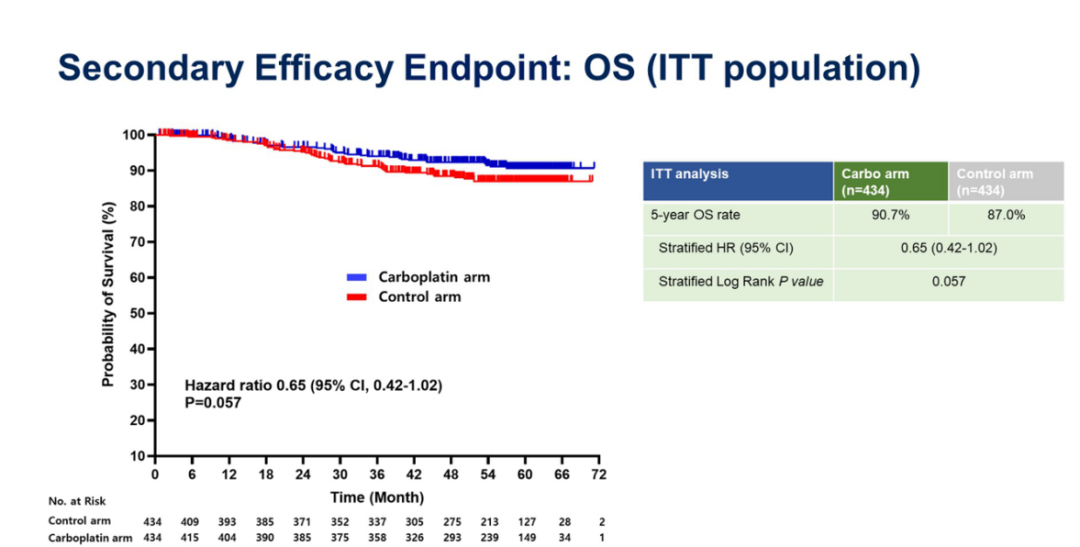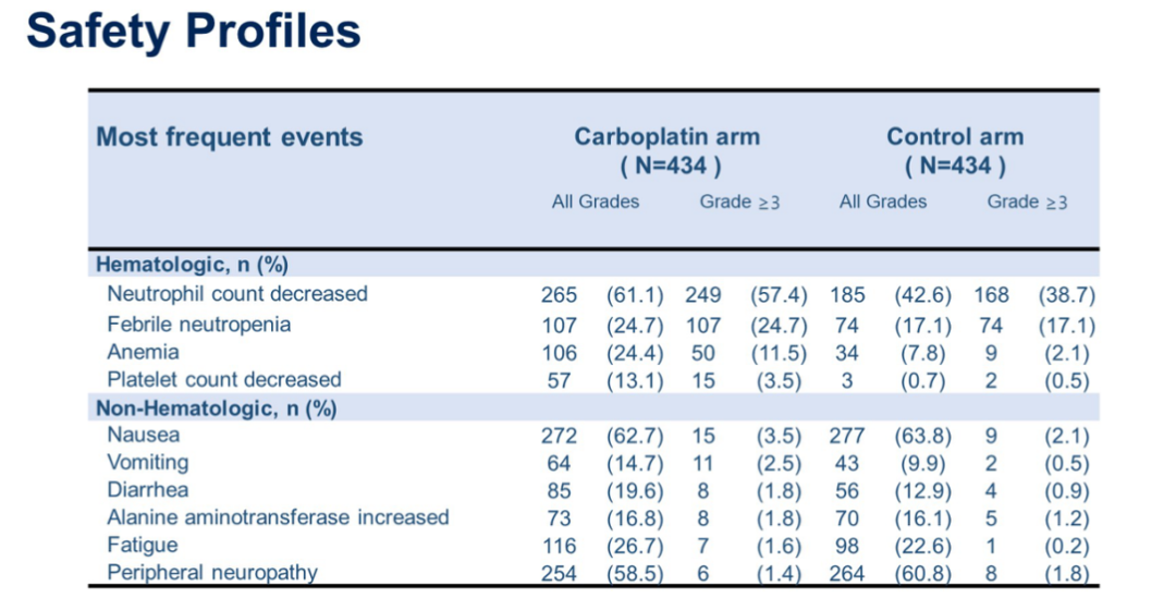 次要终点OS也有显著改善趋势,IDFS和DRFS等次要终点也有利于卡铂治疗组。安全性评估与既往研究相一致。