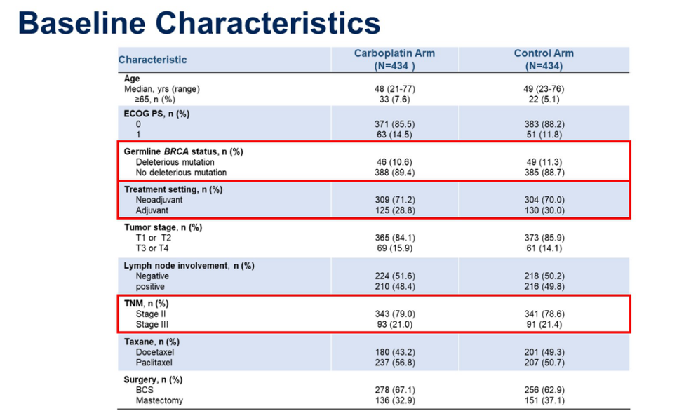 PEARLY是一项多中心、随机、开放标签的Ⅲ期研究,旨在评估卡铂联合蒽环类/紫杉方案与单用标准蒽环类/紫杉方案作为早期TNBC新辅助或辅助治疗的疗效和安全性。Ⅱ期或Ⅲ期TNBC患者被随机分配至卡铂组或标准治疗组,按机构、淋巴结状态、治疗背景(新辅助vs辅助)和gBRCA突变状态分层。标准治疗包括多柔比星和环磷酰胺(AC),随后进行紫杉治疗。试验组为AC治疗后给予卡铂和紫杉醇治疗。主要终点为EFS,而次要终点包括OS、浸润性无病生存期(IDFS)、无远处复发生存率(DRFS)、pCR率和安全性。