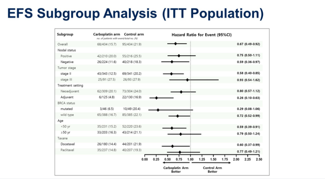 对研究入组人群进一步进行分析,我们可以看出,入组的Ⅱ期患者约占80%,Ⅲ期患者约占20%,这和我们临床实践遇到的三阴性乳腺癌患者比例相似。EFS亚组分析中结果也显示,Ⅱ期患者获益率更高。在其他分层中,小于50岁患者人群、BRCA突变患者人群、淋巴结阴性患者人群均获益更多,该研究结果为早期三阴性乳腺癌患者的选择铂类治疗提供了更多的信心和数据支持,为铂类在早期三阴性乳腺癌患者治疗提供了更多的潜在可能性。