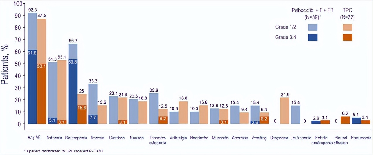 在数据截止时,264例患者被预筛选,73例患者被随机分配。基线患者特征总结在表中。在队列C1中,50%的患者接受了氟维司群作为ET,50%接受了芳香酶抑制剂。在队列C2中,37.1%的患者接受了T-DM1治疗,45.7%接受了CT+T治疗,11.4%接受了ET+T治疗,两名患者在开始治疗前撤回了同意。与TPC相比,哌柏西利+T+ET与更长的PFS相关[中位PFS 9.1 vs.7.5个月,分层HR=0.52(95%CI:0.29~0.94);双侧P=0.031];12个月的PFS率分别为43.7%和21.4%(图4)。队列C1的总体缓解率为18.9%(95%CI:8.6~35.7),而队列C2为8.3%(95%CI:1.4~28.5)(图5)。在C1队列中,51.3%的患者发生3级或以上治疗相关不良事件,而C2队列中为28.1%(图6)。试验组中最常见的3级或以上不良事件是中性粒细胞减少(53.8%)(图7)。