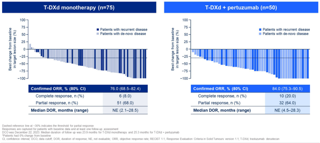 T-DXd组治疗了75例患者,T-DXd+P组治疗了50例患者;中位随访时间分别为19.2个月(范围:8.7~29.2个月)和20.6个月(范围:13.3~26.7个月)。两组中位年龄分别为57岁和56.5岁。截至2023年12月22日,最常见的不良事件(AE)是恶心[T-DXd,71%(4.0%为3级);T-DXd+P,68.0%(0%为3级)]。腹泻在T-DXd组和T-DXd+P组患者中分别报告为35%(3%为3级)和62%(6.0%为3级)。没有4级及以上的恶心或腹泻事件。在T-DXd组和T-DXd+P组中,分别有7例(9.3%)和7例(14.0%)患者报告了经判定与药物相关的间质性肺病(ILD)/肺炎(图10)。T-DXd组中报告了1例非治疗相关的AE导致死亡(新冠后急性综合征);T-DXd+P组中无此情况。经确认的ORR在T-DXd组中为76.0%(80%CI:68.5~82.4),在T-DXd+P组中为84.0%(80%CI:75.3~90.5)(图8)。12个月时的PFS率在T-DXd组为80.8%(80%CI:73.7~86.1),T-DXd+P组为89.4%(80%CI:81.9~93.9)(图9)。