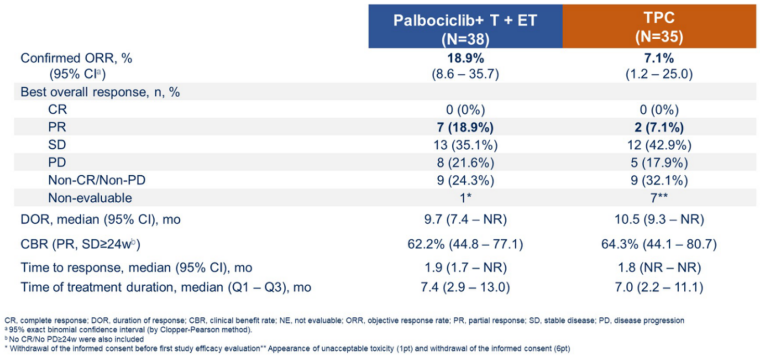 对于既往接受过治疗的PAM50 luminal A或B型HER2+晚期乳腺癌患者,与TPC相比,哌柏西利、T和ET联合治疗可显著改善患者的PFS。临床试验信息:NCT02448420。