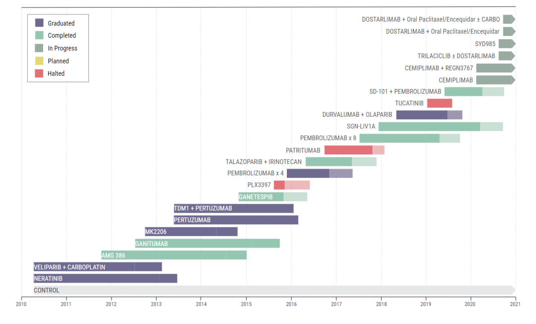I-SPY 2试验(Investigation of Serial studies to Predict Your Therapeutic Response with Imaging and Molecular AnaLysis 2,I-SPY 2 TRIAL)是在新辅助治疗背景下,旨在探讨临床高危Ⅱ/Ⅲ期乳腺癌患者对新药以及新药相关联合治疗方案反应性并探索药物反应性预测指标。I-SPY 2试验采用贝叶斯适应性随机化方法,确保患者可以被分配到最大化治疗效果的亚组,同时减小对统计检验效能的损害。另外,I-SPY2试验以病理完全缓解(PCR)作为主要终点,大大减少试验耗时。在I-SPY2中,当一种药物或一个治疗的贝叶斯预测成功率(Bayesian predictive probability)在验证性的300名患者的Ⅲ期临床实验中达到预设的阈值时(通常为85%),该治疗方案或药物便可从试验中“毕业”[1]。目前DURVALUMAB+OLAPARIB、PEMBROLIZUMAB x 4、TDM1+PERTUZUMAB、MK2206、VELIPARIB+CARBOPLATIN、NERATINIB等药物已达标完成(图1)。