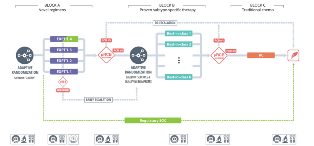 在这一系列试验中,治疗方案可以被分为A、B、C三区;患者将首先随机接受非标准化疗方案(A区,Block A);如果在早期患者影像学评估(MRI)出现低反应或无反应,患者将被随机分配到B区,B区包括先前在I-SPY 2或标准治疗(SOC)中测试过的亚型特异性方案。若依旧在早期评估中反应性较差,B组患者将接受AC(阿霉素/环磷酰胺)治疗。在每个疗程结束时都会对患者进行评估,预测为完全反应的患者有机会直接接受手术治疗(图2)。