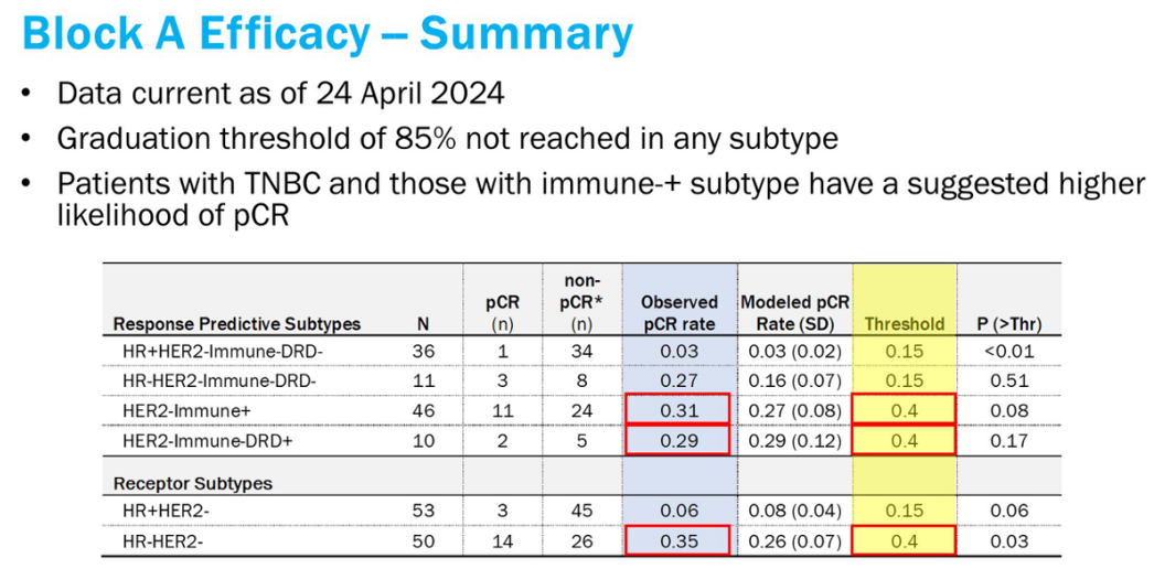 本次报告,证实Dato-DXd在32%的患者4周期有足够强的反应,可以豁免传统化疗直接进行手术。遗憾是研究整体未达到预设界值是阴性结果,但在TNBC和免疫阳性亚组呈现较高的pCR率,提示该药物对这类特定的亚群更有前景。
