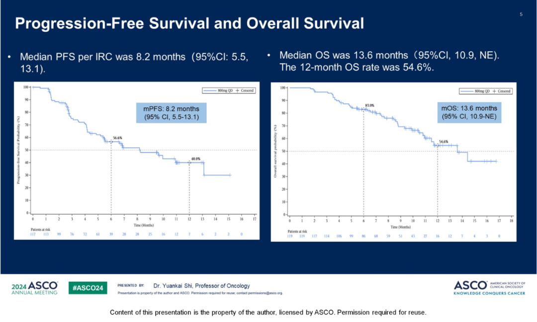 研究显示,Glecirasib的确认ORR为47.9%(56/117),完全缓解率(CR)为3.4%(4/117);疾病控制率为86.3%(101/117)。中位PFS为8.2个月,中位OS为13.6个月。