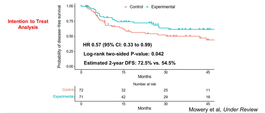 从2017年7月至2023年11月,共纳入143例患者,主要是UPS(85%)和组织学分级3级(64%)。生存患者的中位随访时间为24.1个月。EXP组的估计2年DFS率显著高于SOC组(72.5%vs.54.5%;HR 0.57,90%CI:0.33~0.99,P=0.042)。