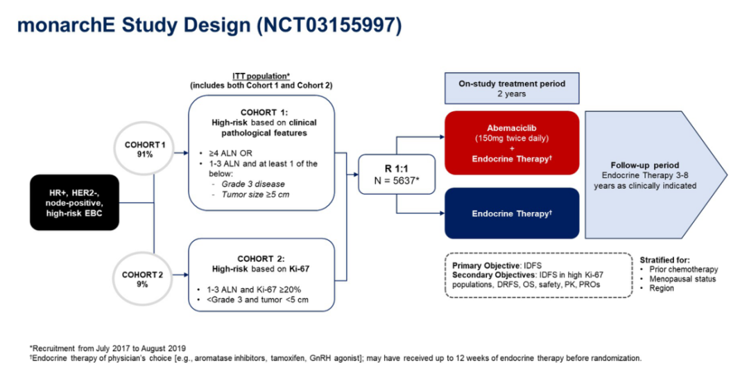 目前,对于HR+/HER2-、淋巴结阳性高危的早期乳腺癌患者,用CDK4/6抑制剂进行强化辅助治疗已经成为标准,虽然MonarchE研究中5年IDFS绝对获益率高达7.6%,但还有相当一部分患者人群的生存没有得到改善,如何区分哪些患者为真正高危人群,也是临床和研究中经常面临的问题。基于此背景,LBA507从MonarchE研究选定的患者亚组(n=1397;阿贝西利+ET组,n=685;ET组,n=712)中分析样本,在研究治疗前(基线)以及治疗后第3、6或24个月时采集血液样本,使用个性化的、肿瘤信息指导的Signatera ctDNA检测(Natera,Inc)进行ctDNA检测,并且对匹配的原发肿瘤和正常组织进行全外显子测序(WES)。