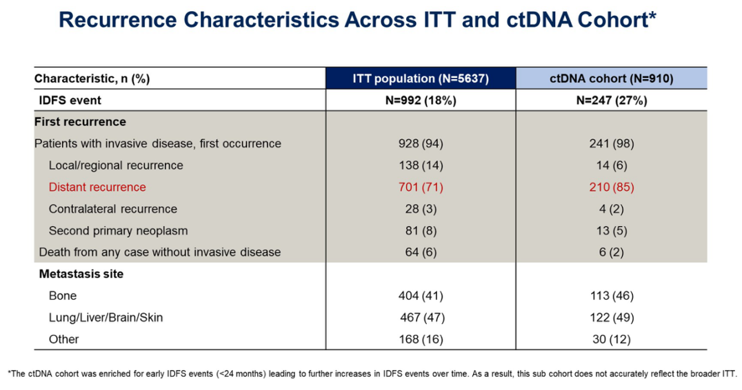在1397名患者中,65%(n=910)有足够的血浆样本进行了ctDNA检测以及肿瘤组织的WES检测(ctDNA队列)。MonarchE研究ITT人群IDFS事件率为18%,而ctDNA队列由于富集了发生IDFS的人群,其IDFS事件率为27%(阿贝西利+ET组为23%[101/438];ET组为31%[146/472])。