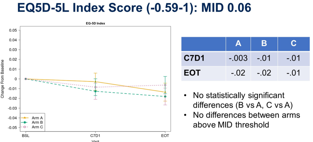 同样,组间的EQ-5D-5L指数评分也无统计学显著差异,同时也未超过临床重要差异阈值。
