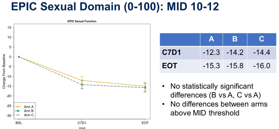 对于EPIC性功能评分,组间并无显著差异,也未超过临床重要差异阈值。