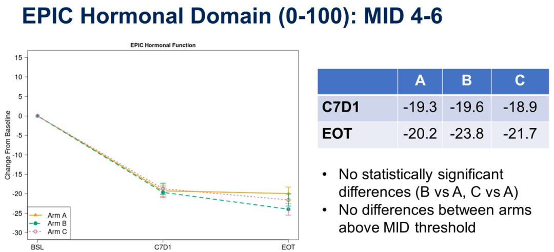 总之,在强化ADT治疗(B组,C组)与单纯ADT(A组)间,任何HRQOL测量均未报告统计学上显著差异。