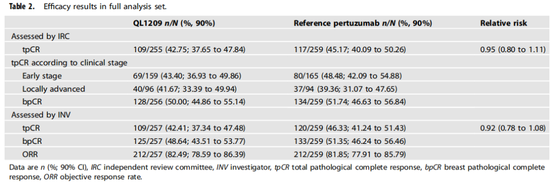 一项评价QL1209或帕妥珠单抗分别联合曲妥珠单抗及多西他赛用于早期或局部晚期HER2阳性、ER/PR均为阴性乳腺癌新辅助治疗的有效性和安全性的多中心、随机、双盲、平行对照Ⅲ期临床研究。在2020年11月至2022年5月期间,共入组517例患者,其中516例接受治疗纳入全分析集(FAS),患者按1:1比例随机分配至QL1209试验组(n=257例)及原研药对照组(n=259例),两组患者分别接受QL1209或原研药+曲妥珠单抗+多西他赛新辅助治疗4周期,并在术后进行病理反应评价。随后两组患者均接受氟尿嘧啶+表阿霉素+环磷酰胺(FEC)辅助化疗(第5-7周期)、QL1209+曲妥珠单抗(第8-20周期)。主要研究终点为独立评审委员会(IRC)评估的总体病理完全缓解率(tpCR)。次要研究终点为研究者评估(INV)的tpCR率、基于IRC和INV的乳腺病理学完全缓解率(bpCR)、客观缓解率(ORR)、无事件生存期(EFS)、无病生存期(DFS)、安全性、药代动力学(PK)及免疫原性。