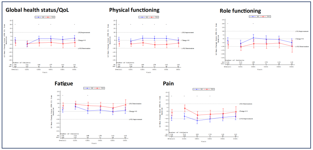 △ASCENT研究:不同时间点的HRQoL得分(蓝线SG,红线TPC)