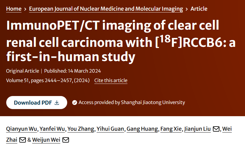 近日,上海交通大学医学院附属仁济医院(简称仁济医院)泌尿科郑军华、翟炜教授团队及核医学刘建军、魏伟军教授团队与复旦大学附属华山医院(简称华山医院)核医学谢芳教授团队先后在核医学顶刊《European Journal of Nuclear Medicine and Molecular Imaging》(IF:8.6)杂志在线发表题为“ImmunoPET/CT imaging of clear cell renal cell carcinoma with[18F]RCCB6:a first-in-human study”。