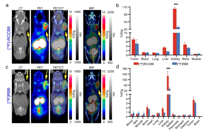 图2:[18F]RCCB6和[18F]RB6免疫PET显像在肾癌PDX中显像结果。(a,c)免疫PET显像结果;(b,d)定量分析结果。