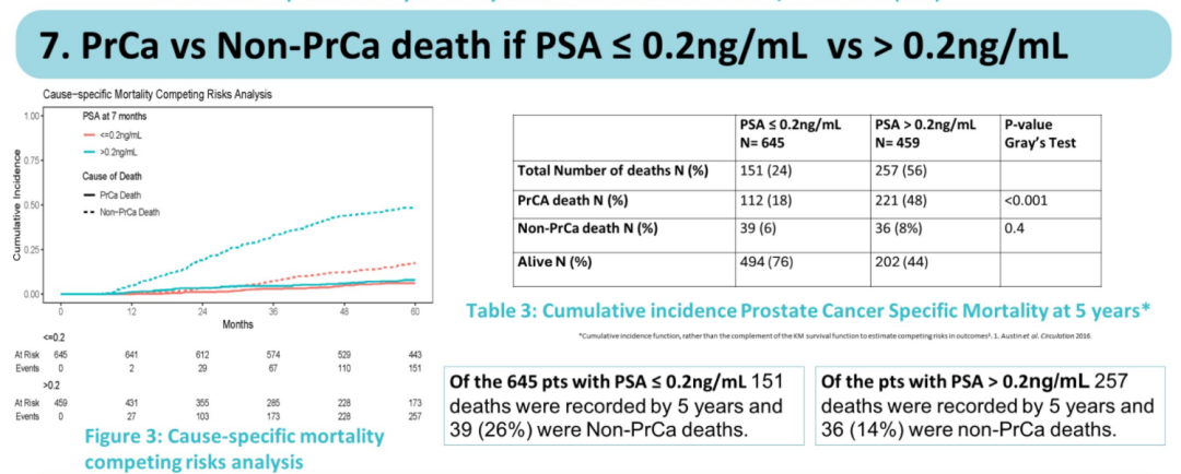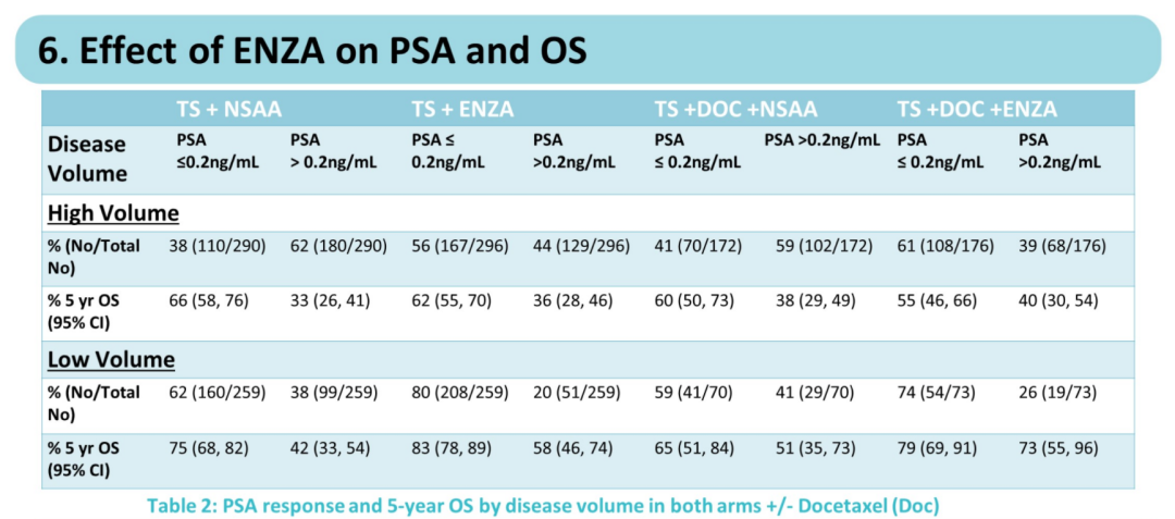 我们知道,PSA是前列腺癌领域应用最广泛的生物标志物,从诊断到疗效和预后评估。既往报道的CHAARTED和SWOG 9346研究,使用7个月时的PSA水平作为OS的预后指标。而本次ASCO大会也报道了ENZAMET研究中7个月时的PSA水平对疗效预后的指示作用。在该研究中,恩扎卢胺组和对照组分别有67%和48%的患者达到PSA<0.2ng/mL。无论是高瘤负荷,还是低瘤负荷,PSA>0.2ng/mL组患者的5年OS率均低于PSA≤0.2ng/mL组患者;在风险竞争分析中,当PSA>0.2 ng/mL时,前列腺癌特异性死亡风险显著增加。