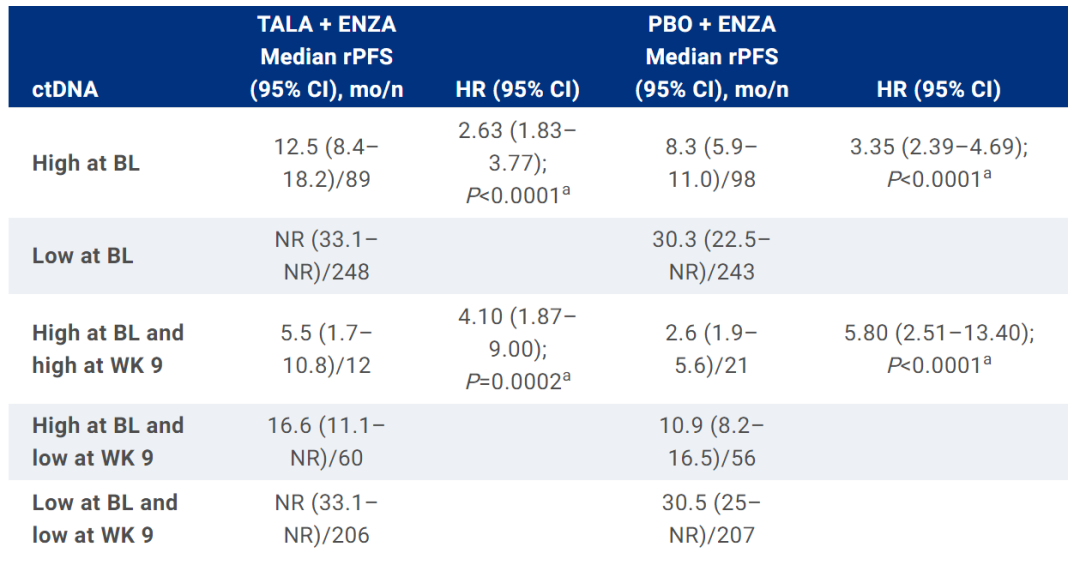 TALAPRO-2研究的一项探索性分析显示,基线ctDNA阳性,以及ctDNA持续阳性(从基线到第9周)的患者,rPFS预后更差;而基线ctDNA阴性,以及ctDNA持续阴性的患者,rPFS预后更好(见下表)。