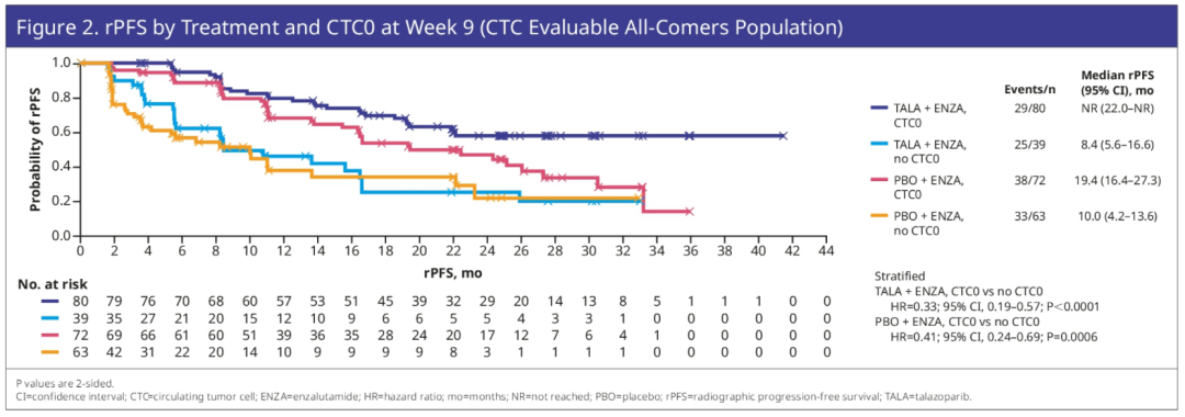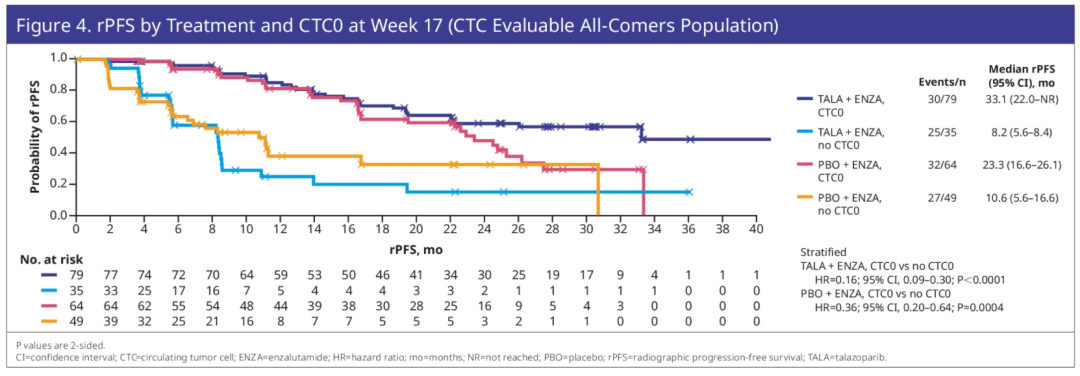 另一项关于TALAPRO-2研究循环肿瘤细胞(CTC)的探索性分析发现,第9周和第17周的CTC清除,预示着rPFS更好。这是首次在3期临床试验中,特别是在PARP抑制剂治疗的背景下,发现CTC与治疗预后相关(见下图)。
