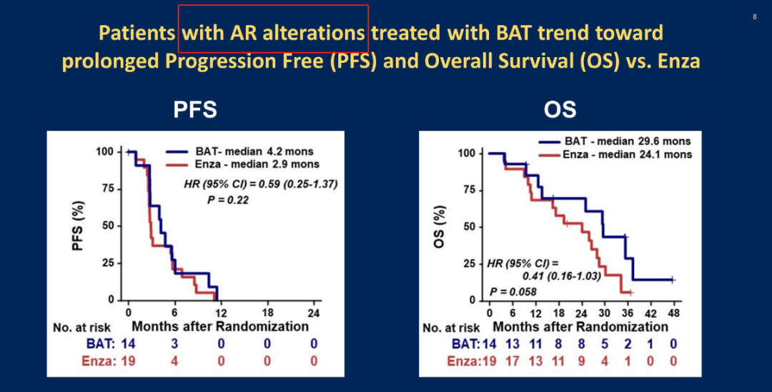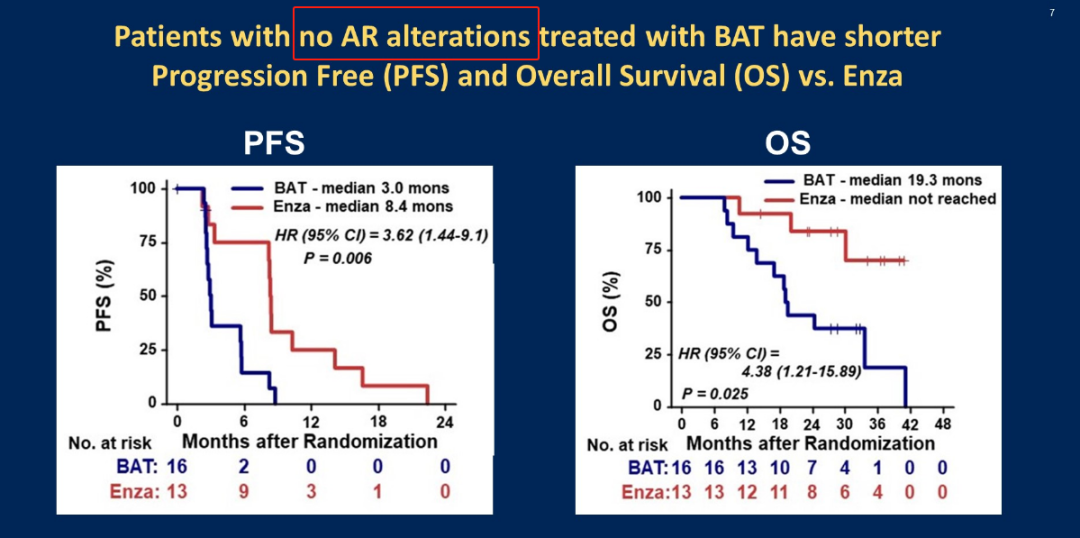 今年ASCO大会以重磅研究摘要(LBA5014)报道该研究的探索性分析,同样分析了ctDNA对疗效预后的指导。结果显示在ctDNA阳性(检测到AR通路突变)患者中,恩扎卢胺BAT的预后好于常规给药(PFS 4.2 vs 2.9个月,HR 0.59;OS 29.6 vs 24.1个月,HR 0.41);而ctDNA阴性(未检测到AR通路突变)患者中,恩扎卢胺常规给药的预后好于BAT(PFS 8.4 vs 3.0个月,HR 3.62;19.3个月vs NR,HR 4.38)。