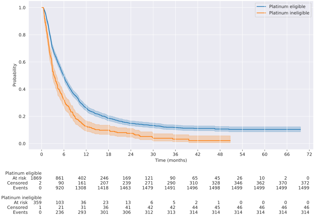 在4270名患者中,2335名(55%)为铂类药物耐受患者,477名(11%)为铂类不耐受患者。由于缺少信息,无法确定其余1458名(34%)患者的铂类药物适用状态。在2335名(55%)接受铂类药物治疗患者中,677名(29%)接受了一线PD-1或PD-L1治疗,1229名(53%)接受了以铂类为基础的化疗方案。在477名不耐受铂类患者中,262名(55%)接受了一线PD-1或PD-L1免疫检查点抑制剂,118名(25%)接受了基于铂类的化疗方案。