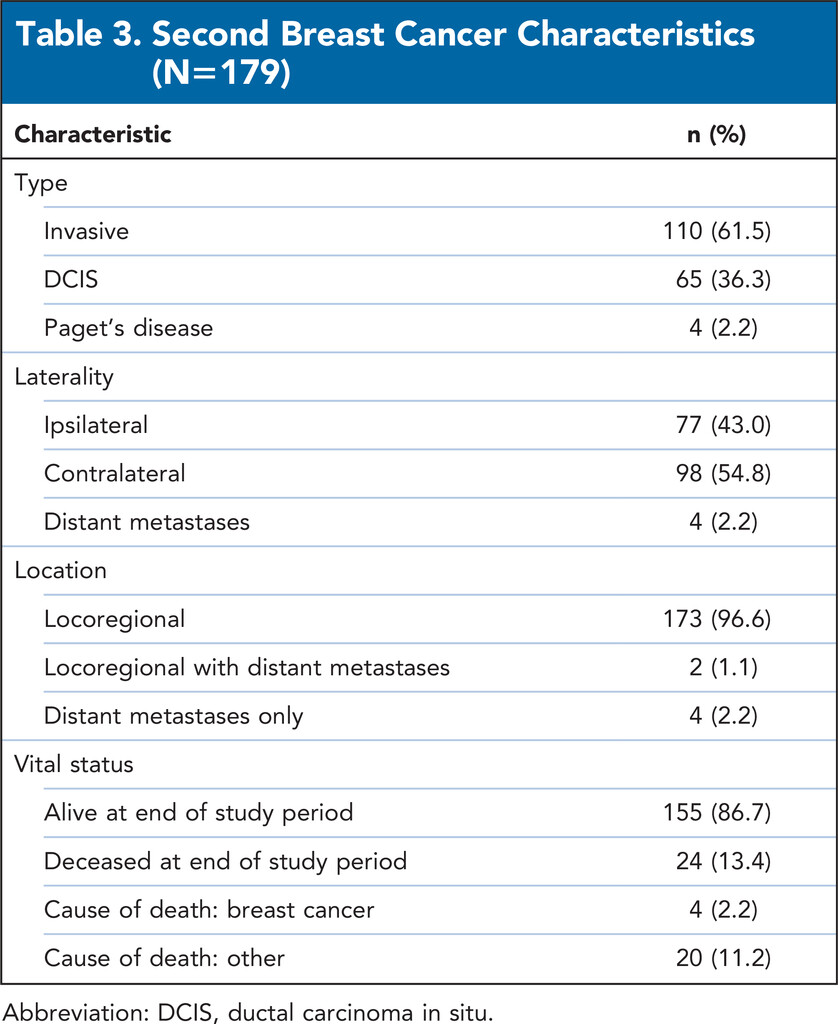 在179名出现第二次乳腺癌的女性中,155名(86.7%)在研究结束时仍然存活,4名(2.2%)因乳腺癌相关原因死亡,20名(11.2%)因其他原因死亡。