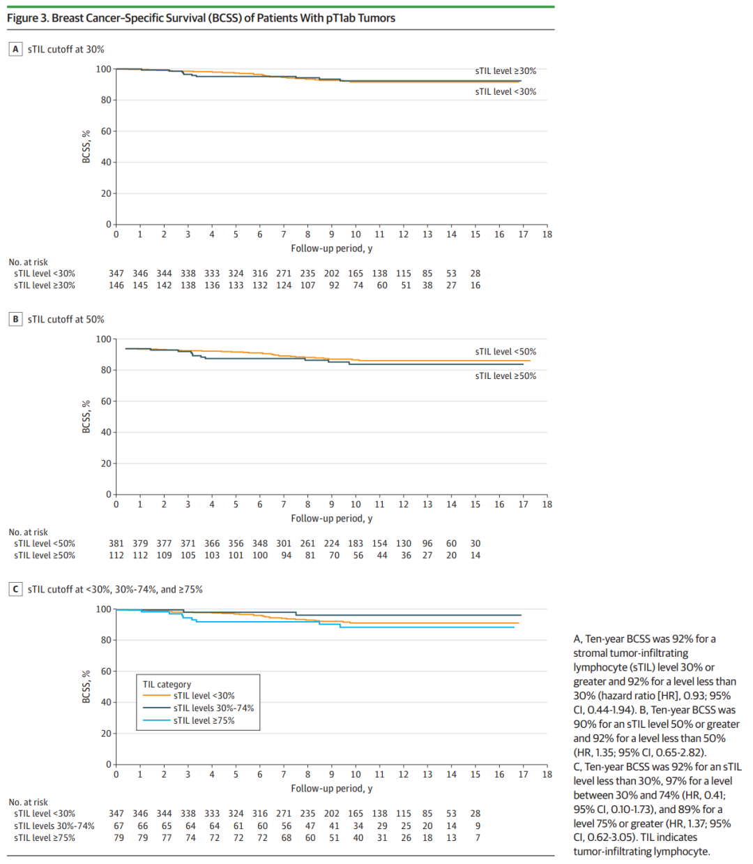 对于pT1c肿瘤的患者,sTIL水平≥50%与sTIL水平<50%相比,与更好的预后相关(HR,0.27;95%CI,0.10-0.74),前者的10年BCSS为95%,而sTIL水平≥75%的患者预后更好,10年BCSS提高到98%。