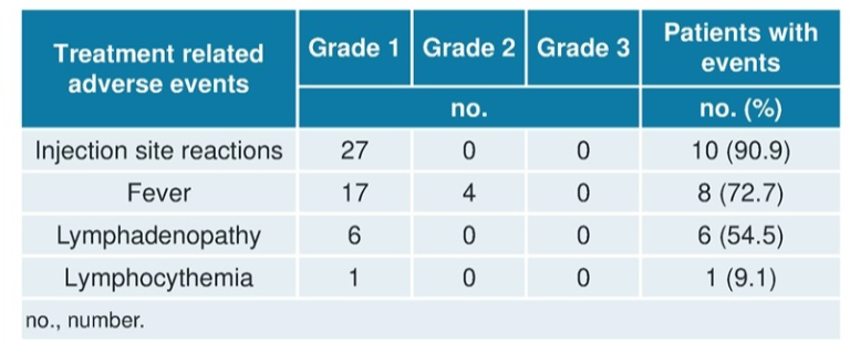 在安全性方面,KSD-101展现出极佳的耐受性。在全部11例接受治疗的患者中,无一例出现DLT或达到最大耐受剂量(MTD)。疫苗相关不良反应多为轻至中度,包括1级注射部位反应(90.9%)、≤2级发热(72.7%)、1级淋巴结肿大(54.5%)及轻度淋巴细胞增多(9.1%)。这些事件均为可控、可逆的免疫活化表现,未观察到免疫风暴、细胞因子释放综合征等严重免疫毒性。